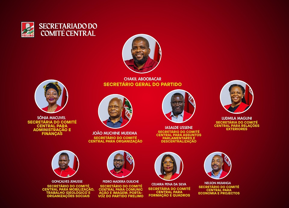 A distribuição de áreas do novo Secretariado do Comité Central da Frelimo, liderado por Chakil Aboobacar, obedece a seguinte estrutura, incluindo os respectivos secretários: (1) Administração e Finanças – Sónia Macuvel; (2) Organização – João Muchine Mudema; (3) Relações Exteriores – Ludmila Maguni; (4) Assuntos Parlamentares e Descentralização – Yazalde Hussen; (5) Mobilização, Trabalho Ideológico e Organizações Sociais – Gonçalves Gemusse; (6) Comunicação e Imagem e Porta-Voz do Partido Frelimo – Pedro Madeira Guiliche; (7) Formação e Quadros – Celmira da Silva; e Economia e Projectos – Nelson Muianga.