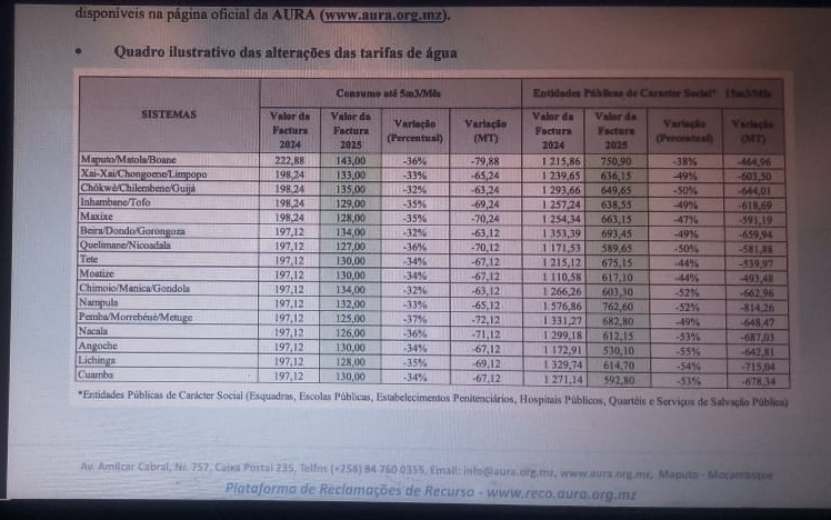 A AURA, Autoridade Reguladora de Aguas, Instituto Publico, comunica que, a partir de 2 de Junho de 2025, entram em vigor as novas tarifas de água potável, com destaque para a redução no consumo mínimo doméstico e introdução de tarifas preferenciais para escolas, hospitais e outras instituições sociais.