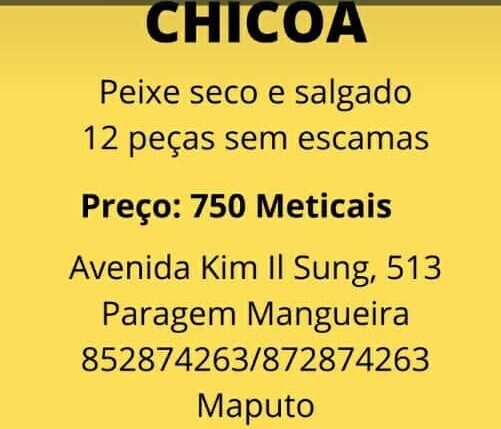 Promoção de ‘Chicoa’ – Peixe Seco de Qualidade em Maputocultura / By camaramen / Fevereiro 20, 2022 Peixe seco e salgado sem escamas na avenida Kim Il Sung 513 em Maputo 529