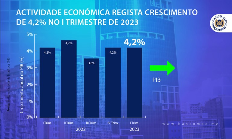 O sector da indústria extractiva, dinamizado pela produção de gás natural liquefeito (GNL), e o sector dos transportes e comunicações é que registaram maior contribuição no crescimento da actividade económica, representado pela variação do produto interno bruto (PIB) no primeiro trimestre do corrente ano de 2023. Refira-se que o sector da agricultura observou um crescimento positivo, apesar da ocorrência de eventos climáticos extremos.