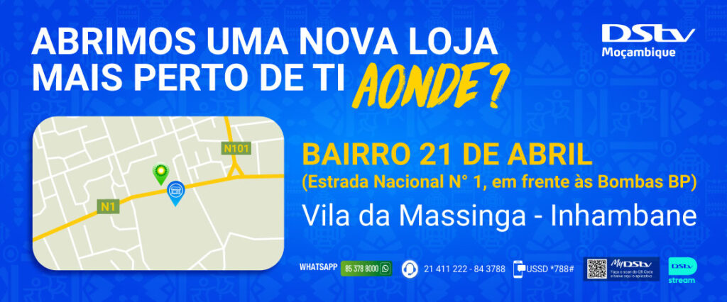 A MultiChoice Moçambique tem a honra de informar a abertura da nova loja, na semana passada, sita no bairro 21 de Abril, ao longo da estrada nacional N°1, em frente às bombas BP, na Vila da Massinga, em Inhambane. A nova instalação visa oferecer aos seus clientesmelhor experiência de atendimento, dispondo de um ponto de venda mais próximo dos clientes.