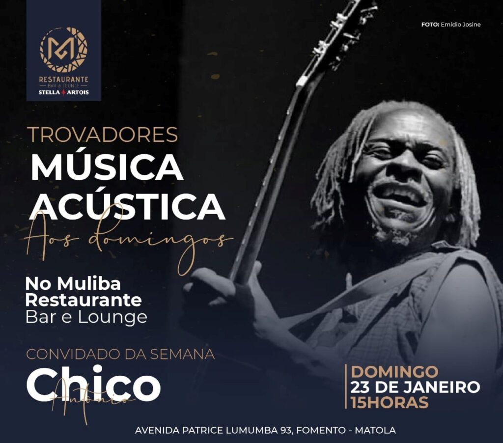 O músico moçambicano Chico António inaugura este domingo (23) sessões de música acústica no Muliba, espaço que se preocupa com a promoção da música moçambicana a partir do bairro Fomento, cidade da Matola. O trovador e a sua guitarra irão garantir pelo menos três horas de música que cruza sonoridades tradicionais e modernas, como se propõe em “Antlissa Maria”, “Baila Maria” e “Mercandonga”.